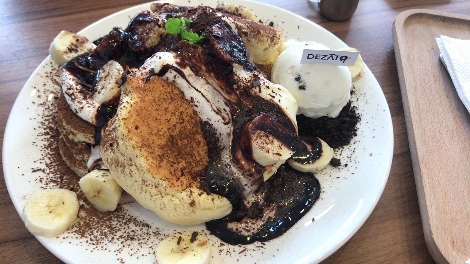 私はバナナチョコレートパンケーキとブラックティーにしました。