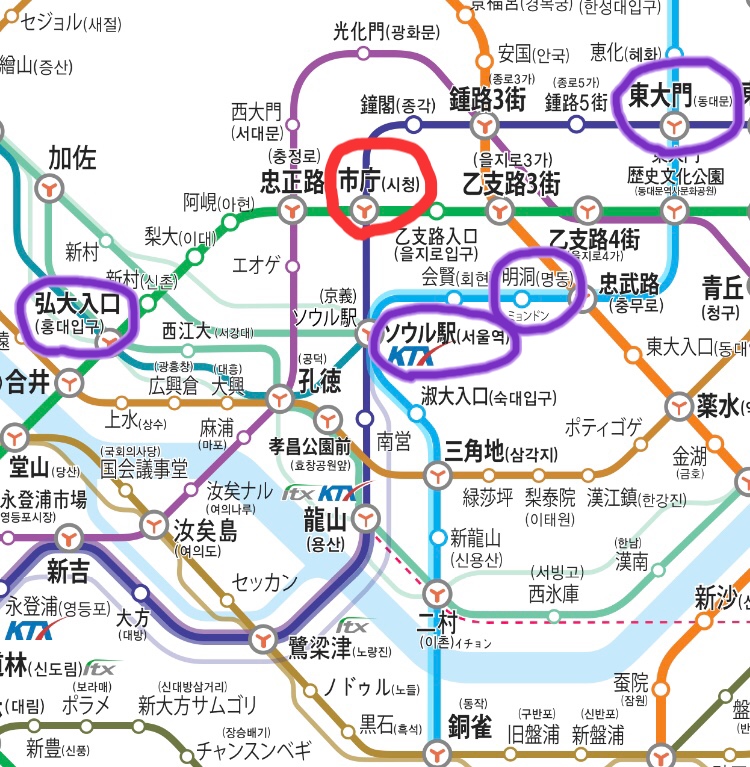市庁駅は弘大や新村や江南などに行ける2号線とソウル駅や東大門に行ける1号線が交わっている駅で好立地です。