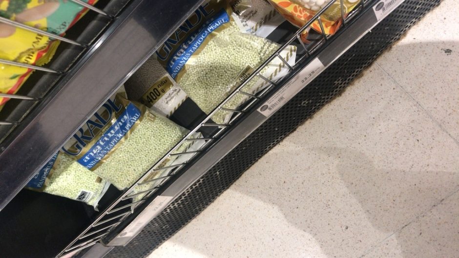 売っている場所は乾燥麺とか乾燥春雨とかそっちではなく、タピオカはデザートで使うため、ぷりんの素とか寒天とか砂糖とかそっち系の売り場に売ってます。